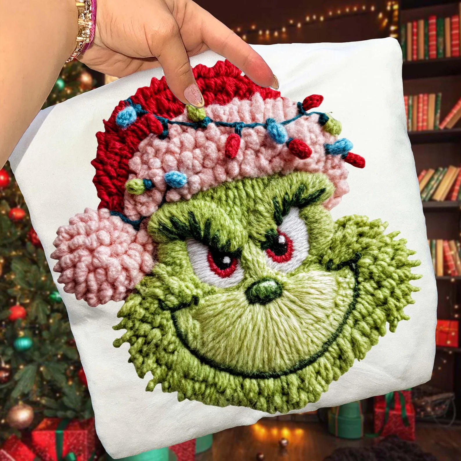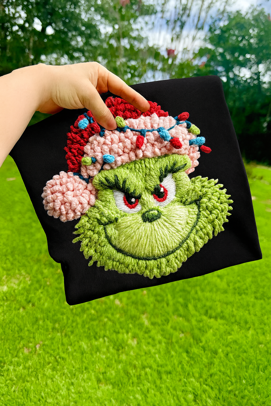 Bring a little mischief to your holiday wardrobe with this Grinch-Inspired Look! Crafted on DTF base, this cozy piece features a bold, hand-tufted design of the iconic green Grinch wearing a Santa hat wrapped in colorful Christmas lights. The detailed texture gives it a 3D, handmade look that pops with personality and festive charm.