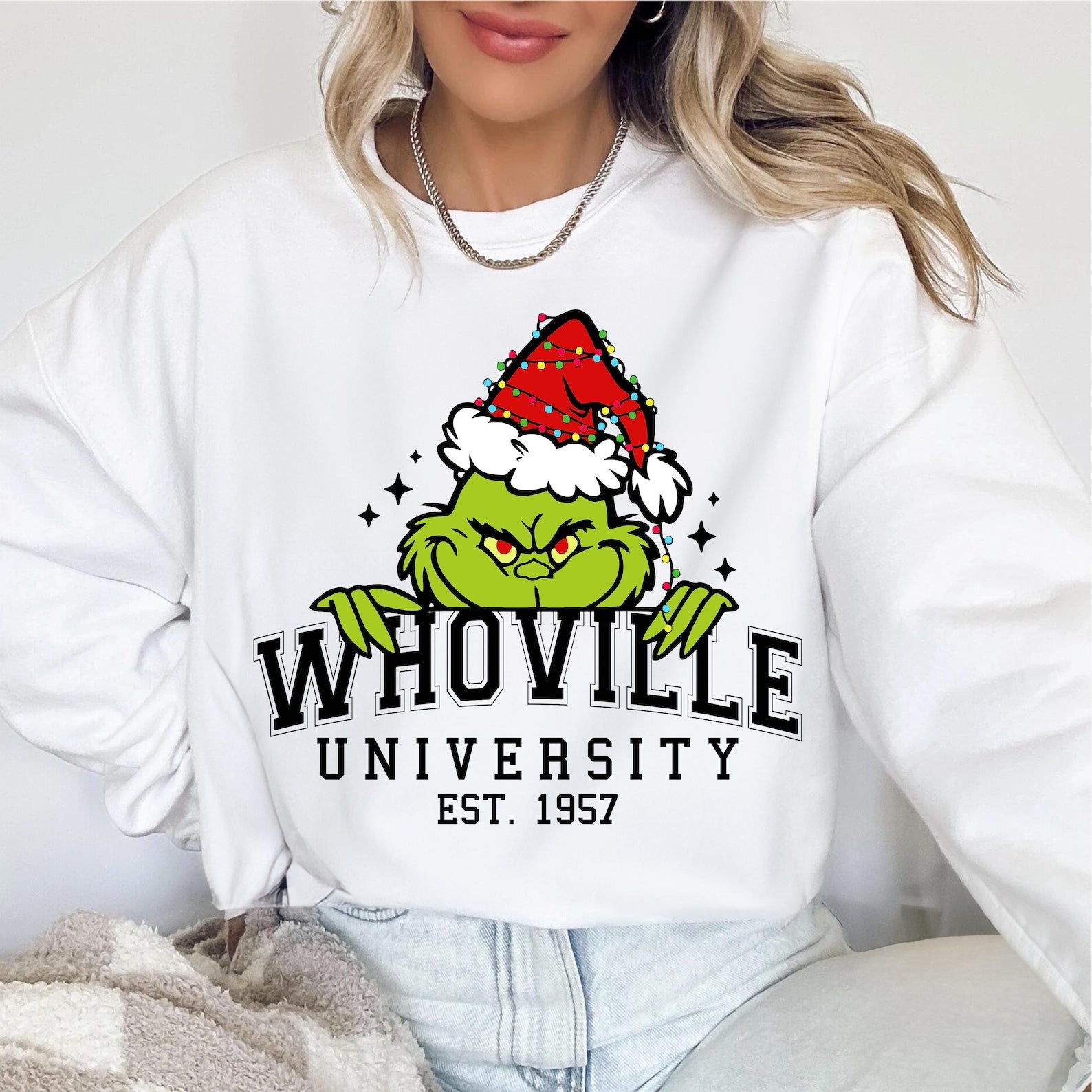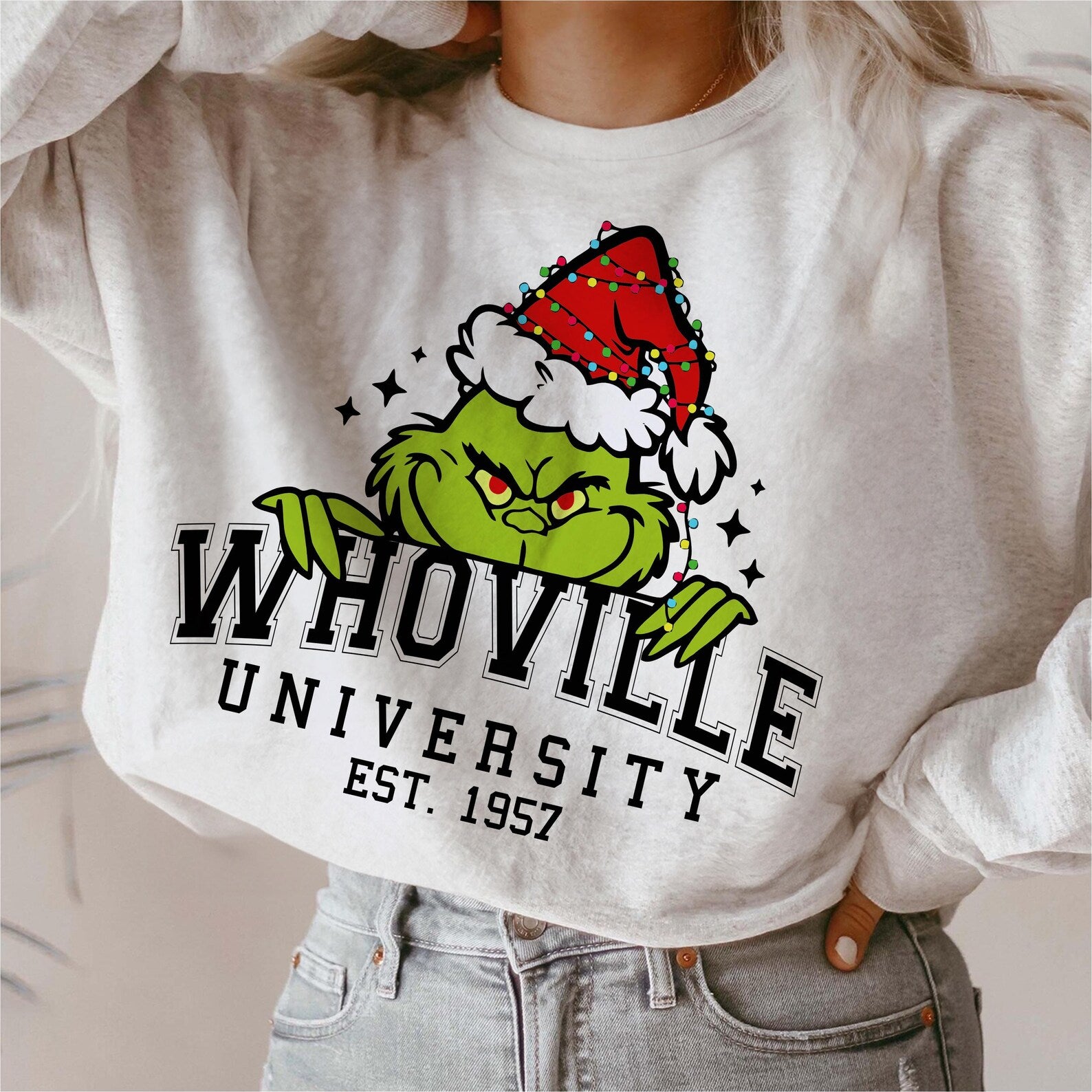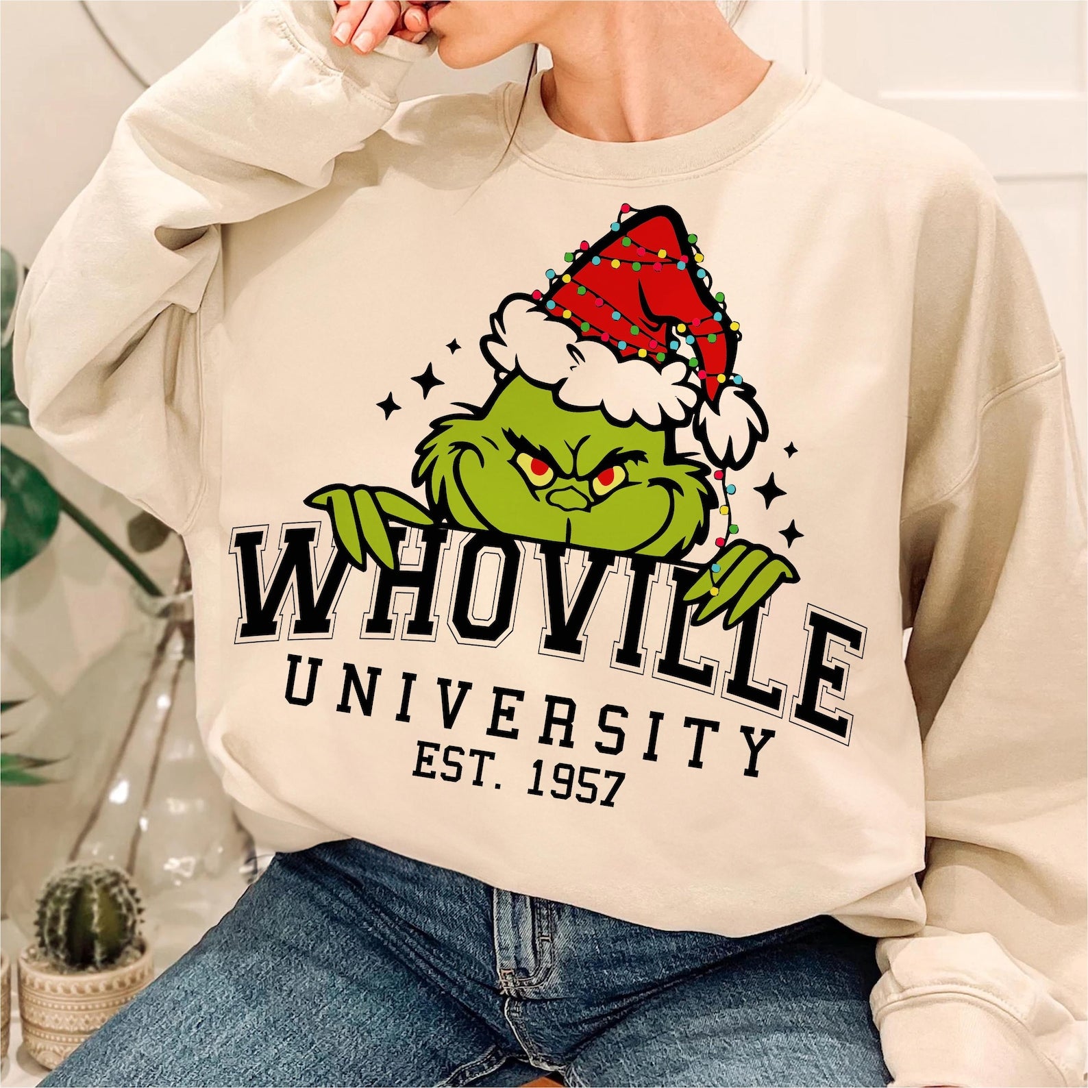 This cozy sweatshirt features the iconic Grinch peeking over bold collegiate lettering, topped with a Santa hat wrapped in twinkling lights. Perfect for holiday lovers with a sense of humor, it blends comfort, style, and festive fun in one must-have piece.