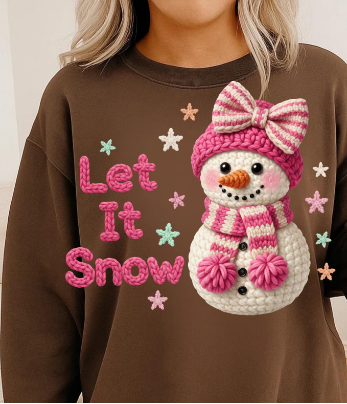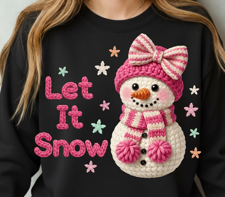 Faux Yarn Let It Snow adorable pink snowman with a cozy hat, striped scarf, and coquette bow. ☃️🎀 Soft, girly, and full of winter charm! ✨